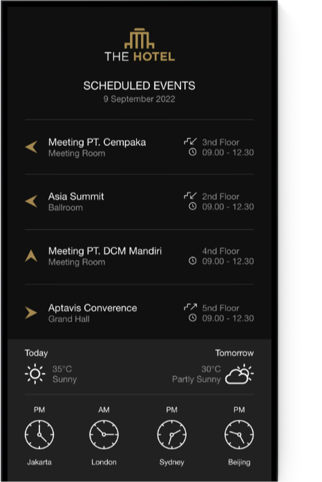 Guide your guests to their destination by showing them room locations, schedules and upcoming events.