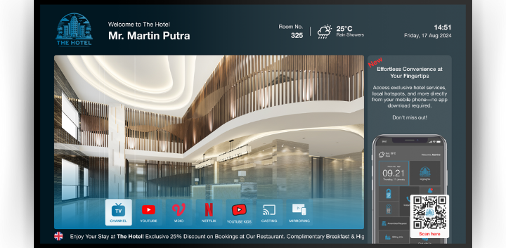 Hotels can offer guests two options—use their own devices (BYOD) or provide in-room tablets, delivering a modern, convenient guest experience while adapting to different preferences.