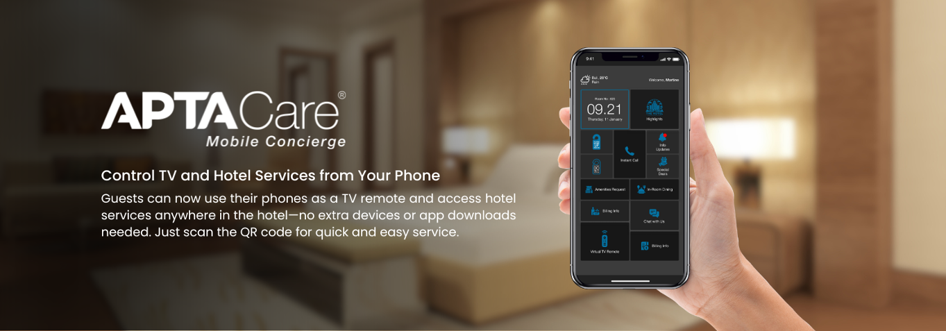 Scan the unique QR code generated by your IPTV system to instantly access APTACare Mobile Concierge. This unique code ensures personalized access to hotel services, TV control, and more—right from your phone with a quick scan, tailored specifically for your room.